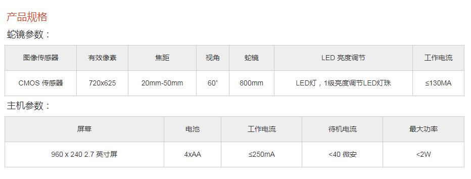 KS07 - MD60 两方向转向内窥镜 产品简介 本产品是一款手持式内窥镜设备,通过内窥镜的图像及视频功能,可以实现无损检查狭小部位及人眼无法直接观察的地方;广泛应用于航空、汽车、管道、机械设备、化工等行业的检测领域。 产品特性 2.7英寸高清显示屏 两方向转向蛇镜±180°,可检测任何难以触及的 空间,无死角 配Ф6.0mm蛇镜, 45万像素 屏幕亮度和6个LED灯亮度可调 带图像旋转功能 具有拍照和录像功能
